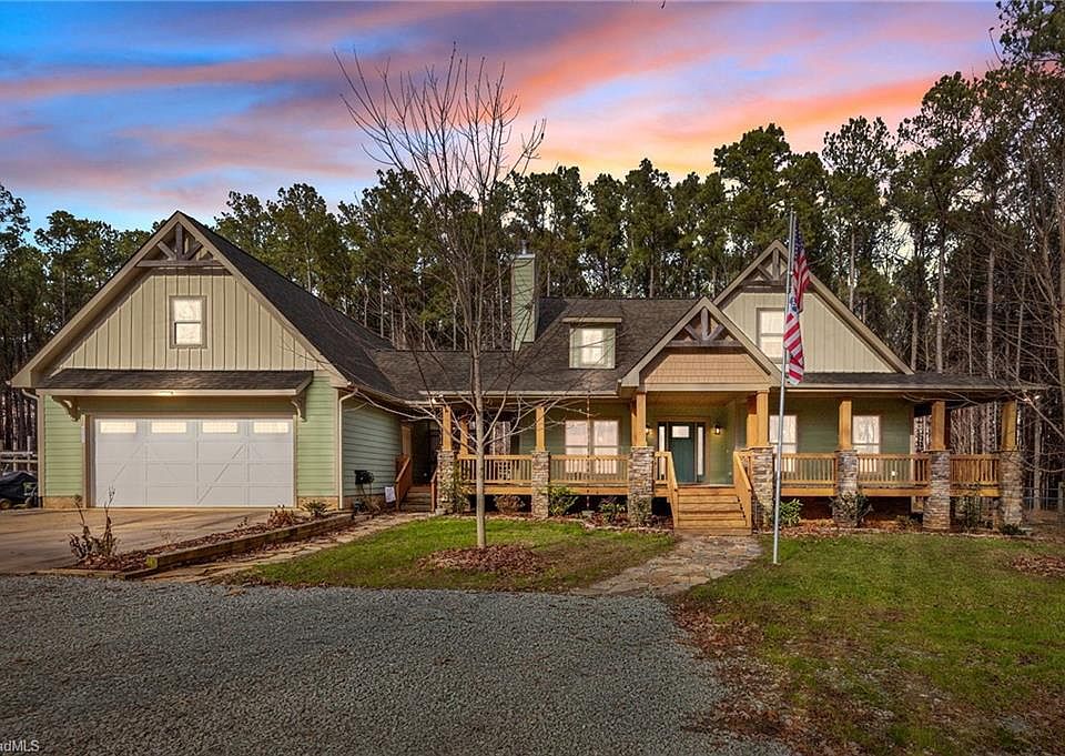Welcome to 3225 Back Acres Road in Efland—a secluded Craftsman retreat on 10+ private acres of hardwoods and pines. A wide covered porch leads into a stunning family room with vaulted plank ceilings, a floor-to-ceiling stone fireplace, and a handcrafted 200-year-old Longleaf pine mantel. The main-floor primary suite features a spa-like bath and walk-in closet, while two additional bedrooms and a loft offer flexible space. Enjoy a custom kitchen with quartz countertops, soft-close cabinetry, and premium KitchenAid appliances. A screened porch, grilling deck, hot tub gazebo, firepit area, fenced garden with greenhouse, and a heated workshop make outdoor living exceptional. Additional perks include LVP flooring, whole-house generator, sealed crawlspace, dual-zone HVAC, and an oversized garage. Horses welcome, and wildlife abundant—your private retreat awaits.