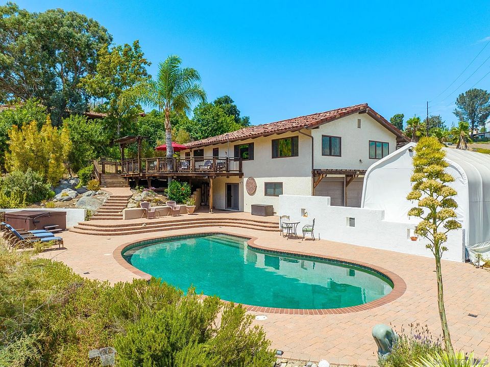 San Pasqual Valley Charmer. Updated and upgraded throughout. Awesome outdoor living with pebbletec pool, decks and forever views up the San Pasqual valley. Kitchen outfitted with custom cherry cabinets, silestone counters and high-end stainless steel appliances. Primary bedroom features an en suite bathroom and private deck. Downstairs there is a 325 sq ft room an adjacent 100 sq ft room and a full bath. Perfect for granny flat, home office, home school, or gym. Owned 9.6kW solar included. Shelter installed on driveway is great for protecting a RV or boat.