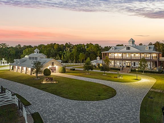 Tucked behind a private gated entrance just north of Tampa and Clearwater Beach, Serella Stables is a ±47-acre luxury equestrian estate blending Southern architecture and refined country living. Featuring a grand custom home, serene pond, and beautifully appointed stables, it offers exceptional privacy and prestige just minutes from the world-class beaches of Florida's booming Gulf Coast. The contiguous acres of Serella Stables are perfectly arranged to balance usability and privacy. The land is mostly level, with a mix of improved pasture and shaded pockets of woodland. Trails wind through the trees, providing access to the more remote parts of the property beyond the main cleared living area. The wooded sections attract abundant wildlife and offer peaceful opportunities to explore, observe nature, or enjoy the quiet beauty of the setting.A fishing pond adds another layer of character to the estate, framed by mature trees and enhanced by a covered dock with a ceiling fan-a tranquil space for reflection or a quiet afternoon of fishing. Every part of the land feels intentional, designed to complement the home and equestrian facilities while preserving the natural beauty that defines the estate. Beyond the gated stone entrance, a brick paver driveway connects the main residence, garage, guest house, barn, and arena in a graceful sweep through manicured lawns and open paddocks. Mature trees frame the landscape and create a natural privacy buffer, giving the entire property a sense of quiet seclusion. The main residence at Serella Stables is a custom architectural statement-crafted with the timeless grace of a Southern estate and the substance of a modern luxury home. Spanning approximately 7,800 square feet, the home showcases a refined blend of natural materials and artisan detail. Wide-plank hardwood floors, reclaimed wood beams, custom cabinetry, and natural stone accents create a warm, sophisticated atmosphere throughout.Walking into the grand two-story entry you'll find a circular staircase, a glass wall showcasing the wine cellar, and an impressive 1400 gallon saltwater aquarium, which is the anchoring centerpiece visible from multiple rooms. From the entry you will be awed by the Aspen-lodge-inspired main living area, which has beautifully crafted tongue-and-groove ceilings, exposed beams, industrial hardware detailing and stone architectural columns, all adding depth and character to this warm rustic ambiance. French doors lead into a private study with ample natural light and a steel safe. A vault-style door provides a dramatic entrance to the walk-down wine cellar with exposed brick and wood giving off Old World charm. The guest bath has a steampunk-inspired pedestal sink crafted from industrial copper piping and riveted hardware. A chef's kitchen features professional-grade appliances, marble counters with custom wood cabinetry, multiple refrigerators and a charming farmhouse-inspired pantry with brick pavers and ample counter space for staging, prep and a coffee bar. The kitchen area seamlessly flows from a large indoor dining area to an outdoor kitchen and grilling area-perfect for entertaining. A curated lounge adds a unique space for entertaining; with its reclaimed wood accents, vintage inspired decor and custom lighting it is the perfect space for conversations, cocktails, and displaying prized possessions. The purpose-built family entrance from the detached garage has simple functionality for daily household organization in mind with wall cubby storage, a versatile central island, and walk-in closet.Upstairs, the primary suite offers quiet luxury with dual walk-in closets and fine finishes, one of which is a boutique-style dressing room featuring frosted floor-to-ceiling built-ins with a dedicated vanity. This floor also provides three additional bedrooms, each with their own full bathroom, custom built-in closets, electronic curtains and french doors that lead out onto the wrap around porch. Each family member or guest can have their own private outdoor sitting area for enjoying the views overlooking the grounds.Expansive porches and covered seating areas provide inviting spaces to take in the property's tranquil views. A swim-spa with bar-like seating on the outside, offers year-round enjoyment. The sellers can provide architectural plans for a pool and second outdoor kitchen, adding further dimension to the estate's outdoor living experience.The center-aisle barn reflects the same craftsmanship as the home, featuring eight oversized, matted stalls, automatic waterers, spacious and well-appointed tack room with half bath, oversized wash bays, and ample storage. Chicago brick flooring, high ceilings, and generous airflow create an ideal environment for horses. Just beyond the barn lies an outdoor arena surrounded by multiple fenced paddocks for training and turnout.A secondary garage and storage building includes an upper-level studio space currently used as a guest room, with completed plans available for conversion into a full guest cottage, photography shows a possible virtual representation. A detached multi-bay equipment building adds practical capacity for vehicles and maintenance while maintaining the estate's cohesive, polished aesthetic. An impressive assemblage of celebrity and collector memorabilia is showcased throughout the residence, with select pieces negotiable as part of the sale or to convey based on offer. Certain furnishings and decor may also be available offering a turnkey option for buyers. Serella Stables offers a rare balance of privacy, recreation, and accessibility-where peaceful country living meets the refinement of Florida's Gulf Coast. The covered dock with ceiling fan provides a shaded retreat overlooking the stocked pond, perfect for unwinding or enjoying an afternoon of fishing in complete tranquility. Endless miles of scenic horseback riding trails are located just moments away, making this an exceptional home base for horse owners of a