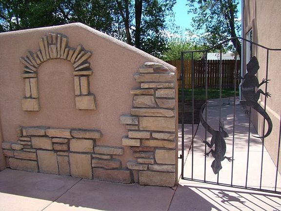 Beautiful stucco wall surrounding the home. Nice cozy yard with a lot of options, herb , flower ,veggie garden set up. On the south side horse shoe sandy area with an great fire pit. Home is 3 be/2 1/4 bath , 1410 sq. ft. Split Master bedroom up stairs. Great place ready to move in .Buyer(s) to verify all information and sq. ft. subject to change.