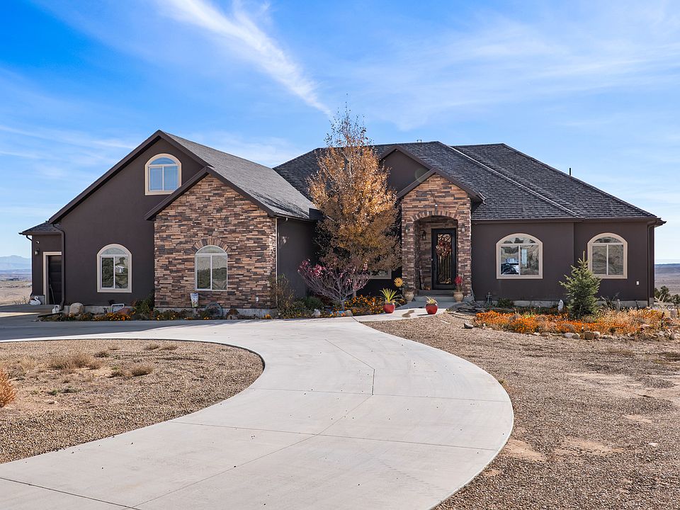 Rare Hill Top home overlooking iconic Pinnacle Peak! This stunning custom home sits on 10.66 acres in one of Carbon County's most prestigious locations. Featuring 4,493 sq ft, 6 bedrooms, 4 bathrooms, and a 4-car garage. Enjoy an open floor plan, granite countertops, double wall ovens, pot filler, and custom tile work throughout. The fully finished walkout basement opens to a spacious patio, and a deck off the living room and master suite captures the breathtaking panoramic views. Additional highlights include a beautiful office with built-ins, a bonus room above the garage, central air with heat pump, cement circular driveway, and stunning architectural details. A truly once-in-a-lifetime property. Homes in this location rarely become available! Square footage figures are provided as a courtesy estimate only. Buyer is advised to obtain an independent measurement.