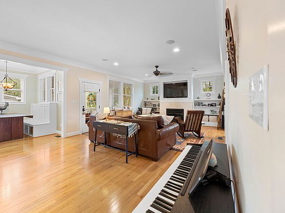 Step into this stunning former Homearama home, honored for its exceptional layout & design. The welcoming foyer boasts an open-concept floor plan, with farmhouse-style trim & high wainscoting. The custom eat-in kitchen is both beautiful & functional, seamlessly blending into the main living space, which features built-in cabinetry around a cozy gas fireplace. Just off the family room, you'll find a bright home office; perfect for remote work, plus an inviting screened-in porch. Upstairs, all 4 spacious bedrooms continue the home's elegant trim work & attention to detail. The primary suite offers a generous retreat, complete w/glass-paneled French doors leading into a luxurious bath featuring a stand-alone soaking tub & a tiled walk-in shower. The mudroom, w/custom cabinetry, a built-in bench & wall hooks. From here, access the detached garage, which includes an open-air covered patio that can double as additional parking or a shaded outdoor entertaining space.