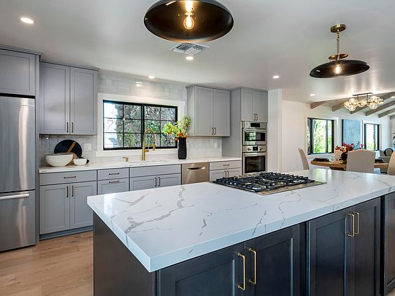 Contemporary farmhouse in Skyline Park! Enjoy this completely remodeled residence and granny unit on nearly 1 acre. The bright and sophisticated home offers lovely cathedral ceilings and oak flooring throughout with mountain views from a large picture window. A chef's kitchen features quartz counters and painted custom cabinetry. High quality appliances will delight the chef and the open floor plan can be enjoyed by friends and family alike. The primary suite and bath opens to a patio with views of specimen trees and mountains in the distance. There are two additional bedrooms with a bath featuring trendy tile and fixtures. The office is conveniently located near the kitchen and has a lovely full bath adjacent. In addition, there is a darling 600 SF detached granny unit off of the 2 car garage. It features a living room, kitchenette, bath and bedroom. Something for everyone on this nearly 1 acre including a 3 stall barn and open field with room for horses or farm to table vegetable beds. Add a pool and outdoor kitchen and you have it all! Your dream to finish. In addition, Skyline Park is known for its very reasonable water rates and easy access to all shopping and amenities.