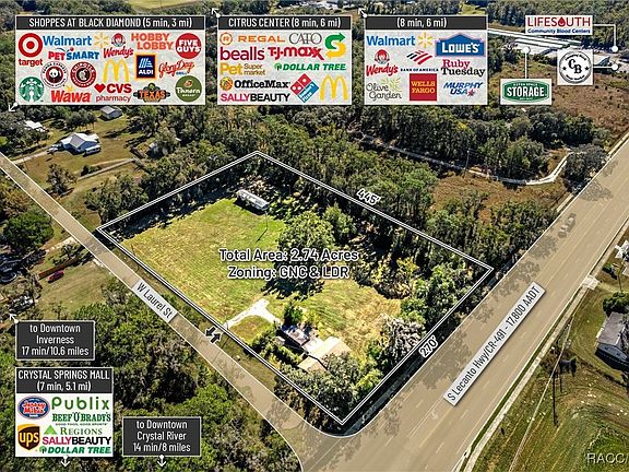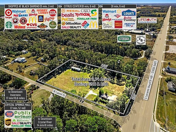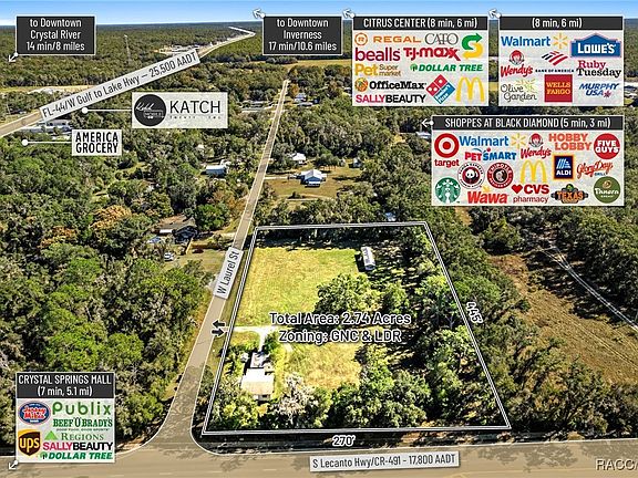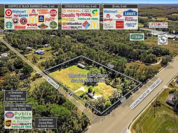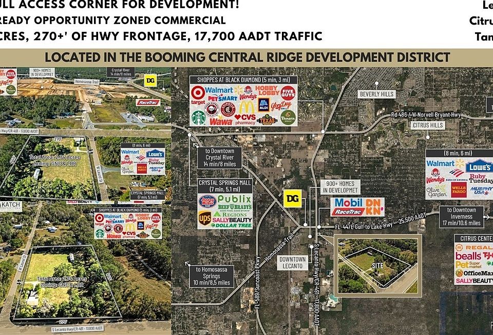 Prime 2.74± acre commercial corner located in the heart of the rapidly growing Central Ridge District of Citrus County. This cleared, development-ready site offers exceptional visibility with 270’ of frontage on CR 491 (Lecanto Hwy – 17,800 AADT) and additional frontage on W Laurel St, just two blocks from the signalized SR 44 intersection (25,500 AADT). Full median access allows unrestricted ingress and egress for north- and southbound traffic. Zoned GNC/LDR, the property supports a wide range of uses including retail, medical office, restaurant with drive-thru, automotive, hotel, multifamily (up to 10 units/acre with PUD), and more.
