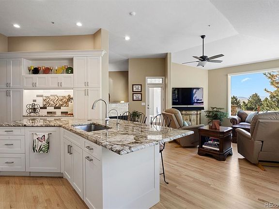 This beautifully updated, low maintenance, patio home in The Greens at The Village at Castle Pines offers privacy, stunning mountain views, and modern upgrades. The open-concept design showcases a three-sided gas fireplace, expansive windows that flood the space with natural light, and a seamless transition between the living, dining, and kitchen areas. The remodeled 2024 kitchen features custom cabinetry, granite countertops, and brand-new Bosch appliances, including an induction cooktop— thoughtfully designed for both style and functionality. Additionally, the kitchen is equipped with an RO water filtration system, ensuring pure, great-tasting water right at your fingertips. The main-floor primary suite is a tranquil retreat, with private access to the back deck and breathtaking views of Pikes Peak. Relax in front of the gas fireplace, or unwind in the remodeled en suite bath, complete with double vanities, a freestanding tub, a glass-enclosed shower, and a walk-in closet with custom built-ins. Additional updates include refinished hardwoods and new carpeting (2023). A secondary bedroom on the main level boasts large windows, high ceilings, and easy access to an updated full bath featuring a modern vessel sink. The main floor is completed by a private office, updated laundry room, and formal dining room. The walkout lower level offers two additional bedrooms, a full bath, and a spacious rec room with a dry bar and built-in shelves. A large utility room provides ample storage space. Outdoor living is a highlight, with a spacious deck featuring a built-in gas fire pit, Viking gas grill, and a hot tub. The HOA handles lawn care and snow removal for easy living.