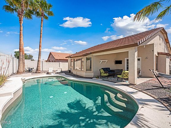 Furnished and move-in ready for a family or investor! This beautifully updated home features a private heated pool and a resort-style backyard complete with an outdoor TV—perfect for entertaining or relaxing in total privacy with no two-story homes nearby. North/south facing with an RV gate and a new roof installed in 2022 with a 10-year warranty. The open, split floorplan offers 3 spacious bedrooms, a versatile den/office, and 2 stylish bathrooms. Both bathrooms include new tile and new toilets, and the main bathroom boasts a new shower and a chic barn door. You'll also love the fresh interior paint, new baseboards, and new tile flooring throughout. All of this in a highly desirable and convenient location! Owner/agent.