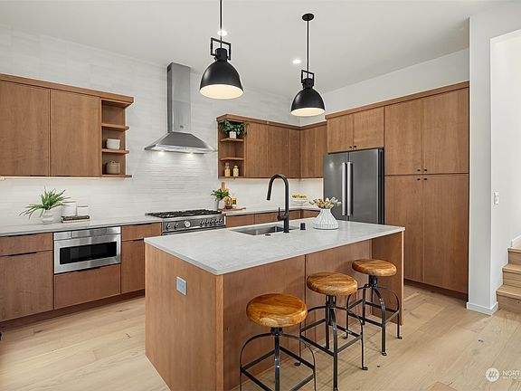 Mint Build presents this chic new home in the heart of Wedgwood. Renowned for their exceptional quality, the thoughtful craftsmanship & design is evident throughout. Warm earth tones and designer finishes lend a custom feel. Fenced yard welcomes you. Expansive main floor with feature gas fireplace opens onto private patio with landscaped, fenced yard. Stunning kitchen offers room for entertaining, plus main floor powder ideal for guests. Upstairs, three generously-sized rooms, including primary suite with walk-in closet. Secure parking with your attached EV-ready garage. Excellent public & private schools nearby. Charming Wedgwood businesses blocks away, plus easy access to UW, Seattle Children's, U Village, Burke-Gilman Trail & many parks.