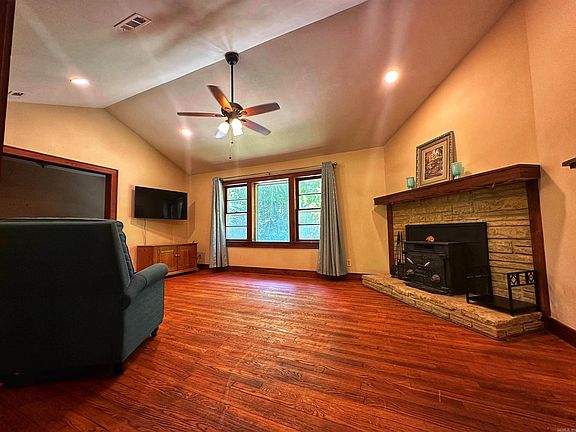 Peace and tranquility- something we all desire- can be found here! This charming home sits hidden away in a quiet little valley just 15 minutes outside of Mountain View with not a neighbor in sight! The little stream running alongside the drive adds to the ambiance of this property! You'll be overwhelmed with charm when you step inside to see the catherdral ceiliing & stone fireplace in the living room and the rich tones of the hardwood floors that run through the house, with exception to the tiled mud room and bathroom! The kitchen has plenty of cabinet and countertop space and the gas range is a cooks delight! If you are looking at adding some small farm animals to your life, you have space to do so on this 1.9 acre (m/l) tract. The chicken coop is already awaiting your flock!