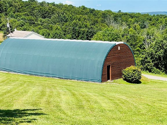 level living with a beautiful modern country feel to the kitchen with nice cabinetry, butcher block island, New Stainless oven/range and gorgeous wood flooring. The views from the Family room/livingroom are spectacular and a great way to start your day sitting on the front deck or watching from your primary bedroom, that boasts a full en-suite with walk-in shower. Spacious family room has a beautiful stone fireplace/pellet stove & wonderful natural light from the large front window. First floor laundry/ utility room includes a washer & dryer set (currently stored in garage) and a brand new furnace installed in 2025. 2 additional bedrooms & a full bath complete this wonderfully maintained home. The home has blown-in insulation, New Larch wood siding, roof, windows & doors, in 2009. You can enjoy the addition as an office, morning room or additional family space. The outbuildings include a 2 story Log Cabin/shed outbuilding (2017) that could be turned into an inlaw apt, also a convenient storage shed w/ double swing to admire the views, a large detached garage that will easily park two cars, & a Quonset Hut/Coverall building w/ overhead doors, all set on 1.83 acres surrounded by fields, gardens, and overlooks green space. This property, with all it has to offer, is truly a gem and a wonderful place to call home.