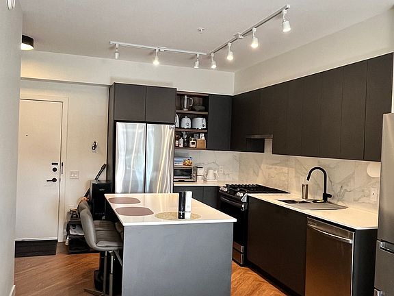 Central location, new low rise huge 1bdrm 1bath 672sf condo w/ huge patio of 279sf which is great for bbq and dogs, high ceilings, s/s appliances and walk in closet. You won't be able to find a unit like this anywhere else. It's very unique! Skytrain 5mins walking distance, shoppers right in front, groceries and coffee shops within 5mins drive. Parking spot comes with an EV charger. Fitness gym, lounge and separate bbq area as amenities. Separate walk out stairs from the patio to the street level. Will be provided with a portable a/c which is more than enough to keep the place cool. One year contract + month to month after