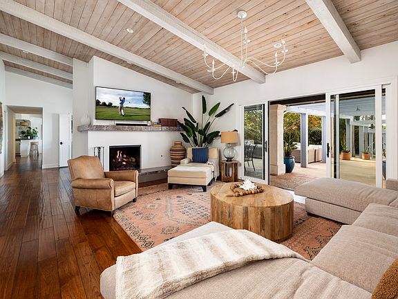 Just beyond the gates of Hope Ranch, this timeless Santa Barbara estate sits on over an acre with lush landscaping, offering resort-like ambiance. The central feature of which is the fully lighted championship tennis court. Specimen palms, terraces, and impeccable interiors elevate its seamless indoor-outdoor lifestyle. The 4BR, 2.5BA single-level home exudes elegance, with wood floors throughout and a vaulted, beam ceiling crowning the formal dining and living room, where a dramatic marble fireplace mantle and hearth are a unique focal point. The family room offers casual elegance with a wet bar and a second fireplace. All three rooms seamlessly connect to the backyard oasis. The chef's kitchen boasts absolute black granite counters, Viking, LG, and Miele appliances, and crisp white beadboard cabinetry, adding a touch of East Coast farmhouse charm. The primary suite is a sanctuary, opening to a private courtyard with a soothing water feature. Its en-suite bath features a luxurious walk-in rain shower. Three additional bedrooms down the hall enjoy garden views and the serenity emanating from the entry fountain. Outdoor living is unparalleled. A covered loggia, built-in firepit, and shady grounds invite relaxation, while a pergola-covered walkway leads dramatically to the tennis court with spectator seating area. The outdoor kitchen, complete with a Lynx grill, granite counters, prep sink, and wine fridge, makes entertaining effortless. An orchard ripe with orange, avocado, and grapefruit trees is further enhanced by towering kentia, king, and date palms, creating a unique and genuinely magical, tropical setting.