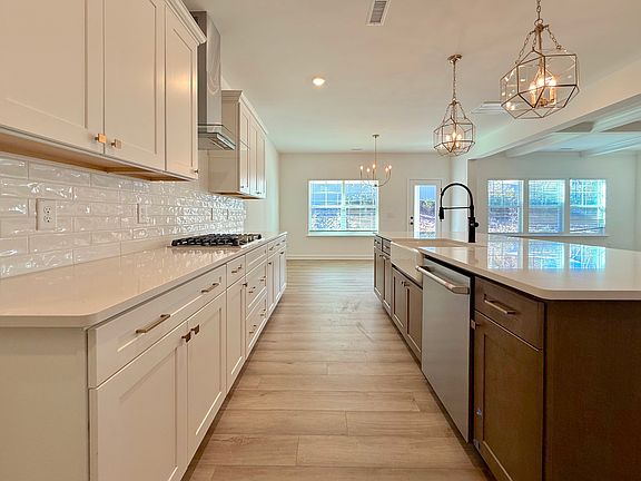 Stunning newly built modern home in the resort-style Georgia's Landing community, just minutes from shopping, dining, and Downtown Raleigh. This move-in-ready two-story residence offers 5 bedrooms and 4.5 bathrooms, including a main-level guest suite, an open-concept design filled with natural light, and upscale contemporary finishes throughout. The chef's kitchen features stainless steel gourmet appliances, a 5-burner gas cooktop, generous counter space. Enjoy a spacious family room with gas fireplace and coffered ceilings, a private oversized office with French doors, and a luxurious laundry room with abundant cabinetry. Exceptional community amenities include a cabana house, pool with lazy river and swim-up bar, scenic trails, dog park, and more.