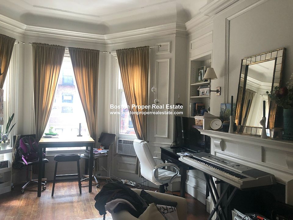 Large 2nd floor south facing studio with pretty bay window and FURNISHED... Hardwood floors, kitchenette, includes heat, hot water and electric. Laundry in building. Single occupant only, no pets. Comes with bed, desk, tv on wall. Very sunny unit with nice view... Great location down the street from the Prudential Center, Copley, and Newbury Street.