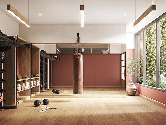 With a highly curated collection of indoor and outdoor amenities, focused on community, health, wellness, and the arts, Bergen provides a universal sense of belonging. Bergen’s Glass House, the source of equilibrium between the East and West residential wings, connects multiple amenity levels through a custom circular stair, providing residents with interconnected access to a multitude of spaces that create a sense of home. Amenity highlights include a full time attended lobby, a ceramic studio led by BKLYN Clay, a private park for residents and two carefully landscaped common roof spaces with gas grills and fire pits designed by DXA Studio and Patrick Cullina.