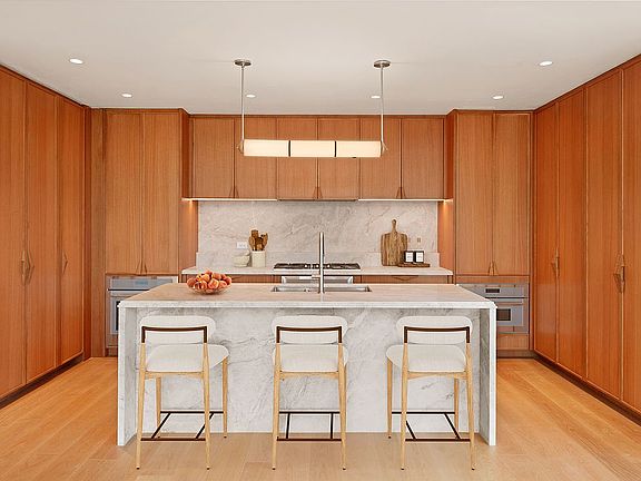 Inside, AD100 Workstead’s interiors blend natural textures and sculptural warmth. The kitchen features custom white-oak cabinetry, a honed Taj Mahal quartzite waterfall island, and integrated Thermador appliances, complemented by a custom wet bar in China White stone and bronze. The primary suite evokes spa-like serenity with honed Crema Vanilla marble, radiant heated floors, and a deep soaking tub, while each secondary bath continues the tone of quiet luxury.
