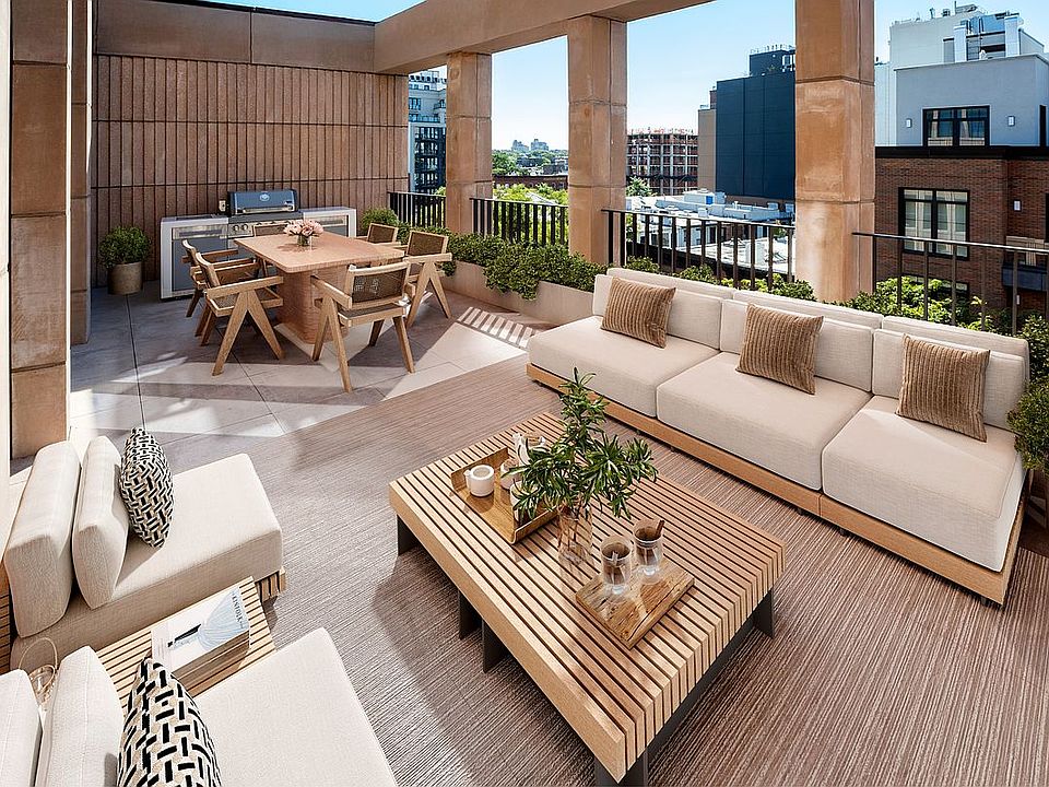 With a highly curated collection of indoor and outdoor amenities, focused on community, health, wellness, and the arts, Bergen provides a universal sense of belonging. Bergen’s Glass House, the source of equilibrium between the East and West residential wings, connects multiple amenity levels through a custom circular stair. Amenity highlights include a full time attended lobby, a ceramic studio led by BKLYN Clay, a private park for residents and two carefully landscaped common roof spaces with gas grills and fire pits designed by DXA Studio and Patrick Cullina.
