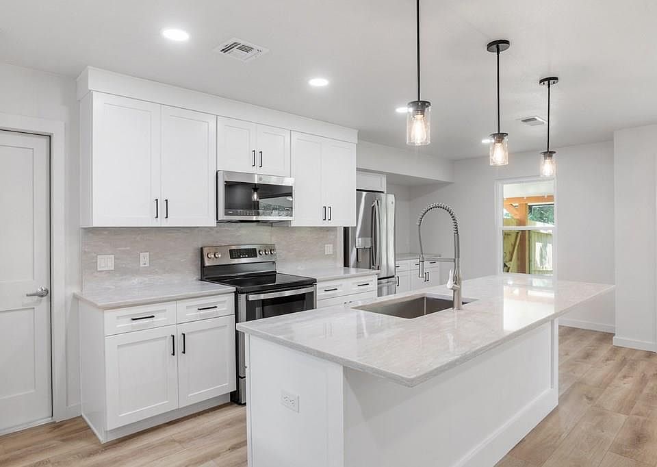 If you're looking for a truly move-in ready property—this is it! A beautifully remodeled 3 Bedroom, 2 Bath home on a corner lot just a short distance to Main St Fredericksburg and all it has to offer. This stunning 2025 remodel combines modern comfort with thoughtful design throughout. Nestled on a spacious corner lot shaded by majestic oaks and mature pecan trees, the home features an open-concept layout with luxury vinyl plank flooring, all new doors, updated hardware, and stylish lighting fixtures. The brand-new chef's kitchen is a true showstopper—boasting quartz countertops, custom cabinetry, GE stainless steel appliances, a built-in buffet, oversized eat-at island, and a convenient office nook. The three bedrooms have generous closet space and large double pane windows which provide natural light. Bedroom 2 & 3 share the hall bath complete with tile floor, tub/shower combo, linen storage, and new vanity with neutral colored counter top & undermount sink. The primary bedroom has an en suite featuring a walk-in shower with glass enclosure, tile floors, and vanity with an undermount sink in the quartz countertop. Step outside to enjoy a fully cedar-plank fenced backyard and a newly added covered patio—perfect for relaxing or entertaining in privacy. An oversized garage provides ample parking space plus storage and features a new door and opener. Additional 2025 upgrades include a new HVAC system, complete electrical rewiring, ceiling fans, updated plumbing, gas service line, fresh sheetrock and modern texture work—offering peace of mind and long-term value. A move-in ready gem with high-end finishes and timeless style in every detail.