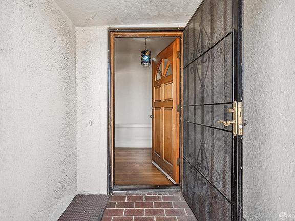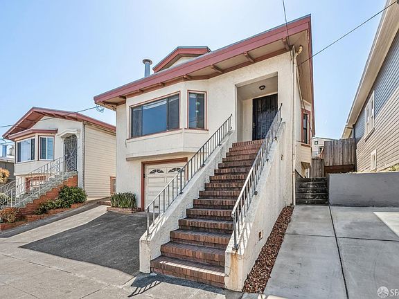 Perched high on its fully detached lot 323 Chicago Way has beautiful views from the living room bay window including Mt. Davidson, Twin Peaks, Sutro Tower, the Bank of America Building and city lights. There are built-in bookcases surrounding the fireplace and hardwood floors. The adjacent dining room has hardwood floors, a bay window and a pass-through to the wet bar. There is a bedroom next to the dining room with a Murphy bed and built-in cabinets. The bath has a low step shower stall and built in cabinets. The large eat-in kitchen is great for cooking, baking and entertaining with a built-in electric oven, free standing gas range and a center island with a Jen-Air cooktop. There is a side by side refrigerator, dishwasher and room for a large table. This room has several windows for great light. The rear hallway has built-in cabinets, a stack washer/dryer and leads to a serene bedroom with several windows. The kitchen door leads to a back deck and patio area. Downstairs there is a huge garage with a workbench, laundry sink, furnace, water heater, circuit breakers and room for a couple of cars. The number 43 bus stops on this street and highways 101, 280, and Bart are nearby.. McLaren Park and San Bruno Mountain recreation areas are nearby. Home loved by seller for 62 years.