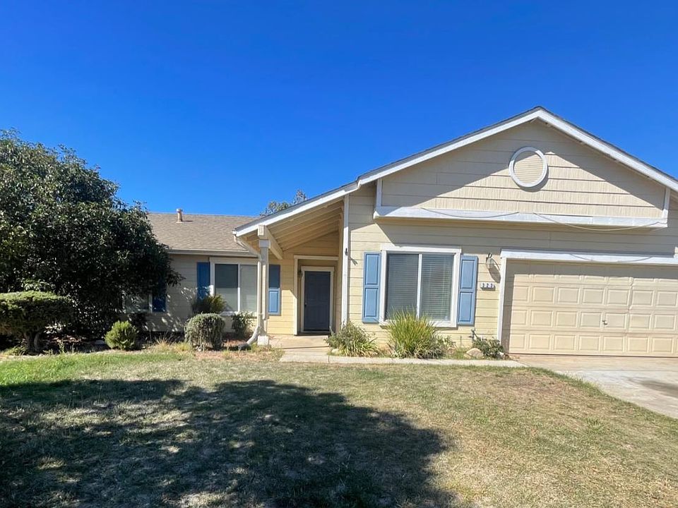 Nice floor plan featuring 3 bedrooms and 2 bathrooms. Primary suite on one side of home offering privacy. Primary bath has double sinks and oversized tub with shower over tub. Other two bedrooms on the other side of home. Formal dining room. Large family room with vaulted ceiling, fireplace, and door to back patio. Garage is the size of a 3 car garage but only a double garage door and a large workshop area that could be turned into a 3rd car garage or room for an ADU? Large patio in back with very nice trellis. Newly painted interior and exterior so move in ready.