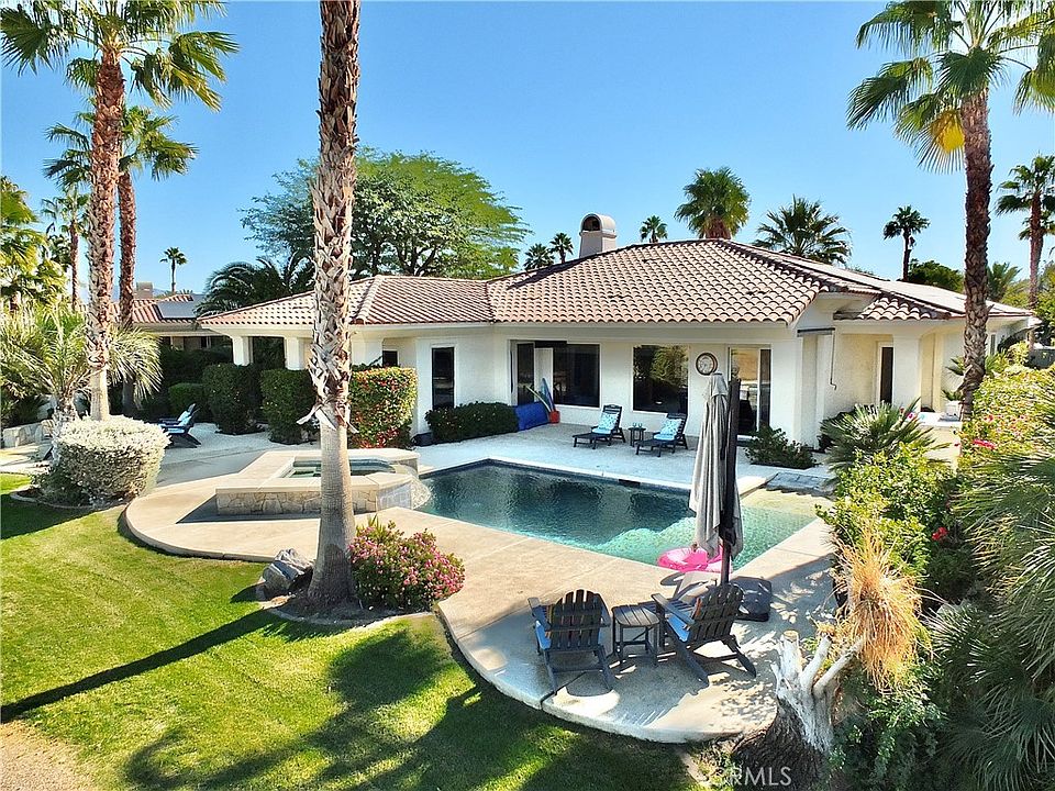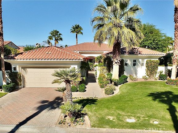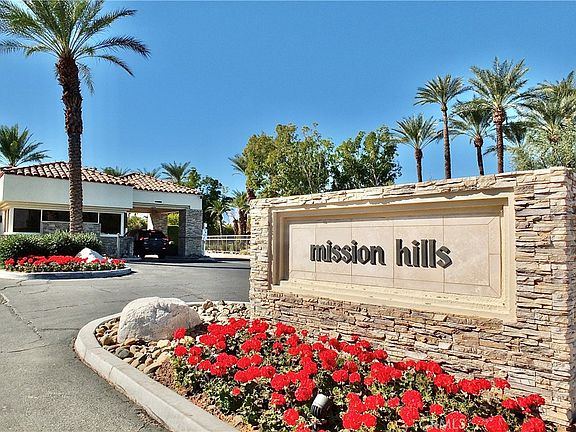 Welcome to 323 Loch Lomond an outstanding luxury desert estate.This exquisite 3-bedroom, 3.5 -bathroom Spanish-style chalet combines desert oasis charm with modern luxury. Located in Legacy at Mission Hills Country Club and on the Gary Player Signature Golf Course, this home boasts incredible mountain and golf course views. There is a wonderful backyard oasis complete with pool, waterfall spa, fire pit and a built-in BBQ island with a mini fridge. An additional generous side yard complete with citrus trees completes the outside living area. This is an entertainer's dream home with a private courtyard entrance,a great room boasting 14 foot ceilings with a fireplace and custom built-in entertainment center. There is also a gourmet kitchen with stainless appliances, granite countertops, double oven, counter-top stove and a convenient butlers pantry. The living room offers spectacular mountain, pool and golf course views. A convenient wet bar is just off the living room- perfect for entertaining guests. The private bedroom wing includes three bedrooms all with ensuite baths. The primary bedroom offers access to the pool and spa retreat, and includes an ensuite bath with marble spa tub, and an exceptional walk in shower and walk in closets. The two car plus a golf cart garage conveniently has its own mini-split AC unit. To reduce electrical use this home is equipped with solar. Legacy ownership comes with Social and fitness membership to Mission Hills Country Club. This home is turn key and ready for you to start enjoying the desert lifestyle.