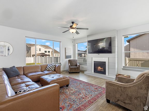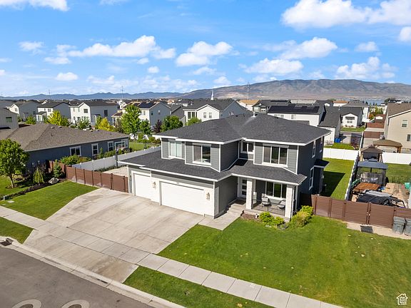 Discover the epitome of modern living in this exquisite 6-bedroom, 4.5-bathroom home nestled on a spacious .29 acre lot within the picturesque Hamptons community. With meticulous attention to detail, this turnkey residence exudes quality craftsmanship and sophistication. As you step inside, you'll be captivated by the impeccable design and luxurious features that define this home. The gourmet kitchen boasts floor-to-ceiling cabinets, stunning quartz countertops, durable LVP flooring, and oversized windows adorned with custom shades. It seamlessly flows into the inviting family room and a charming breakfast nook, creating the perfect hub for family gatherings and entertaining. The main level also offers the convenience of an office and a bedroom with a full bathroom, providing flexibility for various living arrangements. Upstairs, the primary suite is a sanctuary of comfort and elegance. Enjoy breathtaking views of Mount Timpanogos, unwind in the primary bath featuring upgraded subway tile, hexagonal black and white floors and quartz countertops, and revel in the expansive walk-in closet with direct access to the laundry room. Three additional well-appointed bedrooms on this level offer picturesque vistas of Utah Lake and share a full bathroom. Outside, you'll be delighted by the recently completed large fully fenced backyard with basketball/pickleball court. This home is a masterpiece of contemporary design, offering not only exceptional style but also a prime location within the sought-after Hamptons community. Don't miss the opportunity to make this stunning house your forever home. Schedule a viewing today to experience the perfect blend of luxury and functionality!