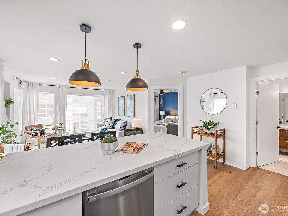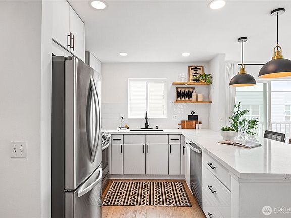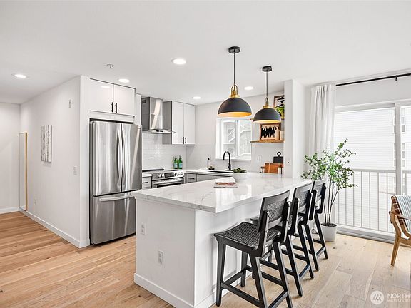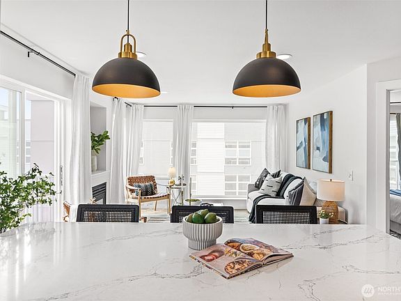 Totally renovated and move-in ready—this one-bedroom lives large with new flooring, cabinets, counters, and appliances throughout. Full of natural light with floor-to-ceiling windows, a private balcony, and one of the biggest 1BR layouts in the building. Spacious bedroom with walk-in closet, in-unit laundry, and primo parking spot. Rooftop deck with knockout views of the city, Sound, and Space Needle. Fitness center, media room, on-site manager. Just a block from Climate Pledge Arena and three blocks to Olympic Sculpture Park. Walk Score: 96. Surrounded by bars, restaurants, and coffee shops—everything you need is right here. This is city living done right.