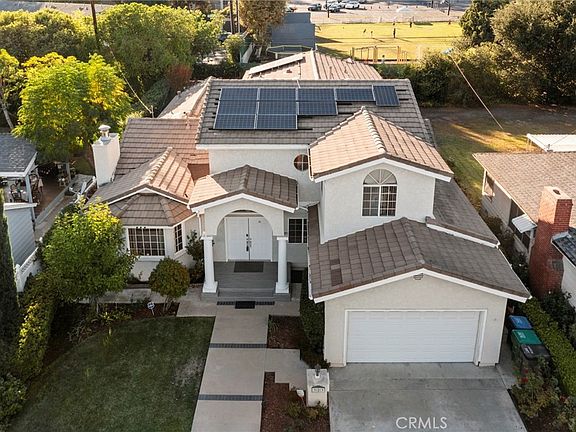 Welcome to this spacious and thoughtfully upgraded 6-bedroom, 5-bathroom home with room for everyone! As you enter through the double doors, you’ll be greeted by a formal entry with high ceilings, a stunning marble foyer with a custom medallion and a very welcoming feeling. The large living room features cozy carpet, fireplace, and recessed lighting—perfect for relaxing or entertaining. A formal dining room for hosting large gatherings. Brand new sliding glass doors help keep things quiet and energy efficient. The custom kitchen is a chef’s dream, with an eat-in island, dining area, GE appliances, a single oven with microwave above, trash compactor, tile flooring, and plenty of storage. The kitchen sink has its own water filtration system. This home offers real hardwood and carpet flooring, ceiling fans in all rooms, built-in speakers, and a security system with a front yard camera for peace of mind. It also has a paid-off solar system, a tankless water heater, and dual-zoned HVAC...each bedroom has its own temperature control for convenience. There are three bedrooms downstairs, including a primary bedroom with a remodeled Jacuzzi bath. Two more remodeled bathrooms are also on the main floor. Upstairs you’ll find three additional bedrooms, including a second primary bedroom with another remodeled Jacuzzi bath, and a hall bath. The upstairs primary bedroom also offers a balcony to enjoy the gorgeous view of the mountains. The inside laundry room includes the washer and dryer (watch your step when entering), and the home features an interior fire sprinkler system for added safety. Outside, enjoy the backyard oasis with a deck, custom pavered patio, artificial turf, and lush landscaping—perfect for low-maintenance outdoor living. With award winning Arcadia Schools and a convenient location, this beautiful home won't last!