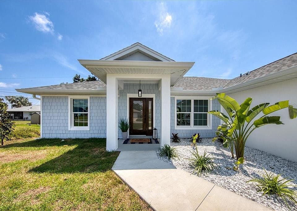 One or more photo(s) has been virtually staged. This 2023 built home features an impressive open and split-floor plan that welcomes you with coastal colors throughout. The home greets you with an exterior of light blue Hardie board siding. Your new home is upgraded with beautiful fixtures and finishes including luxury vinyl plank flooring and custom plantation shutters in all rooms. Cooking is a breeze with state-of- the-art appliances, solid-wood cabinets, generous island and quartz countertops. Every detail in the master bathroom has been carefully considered from the barn door entry to the crisp white and blue shower tile and complimentary colored soft close cabinetry. The guest bathroom features a light blue shiplap wall accent and decorative white picket tile in the shower. The sliding patio door opens to a screened lanai with adjoining paver patio enclosed by an attractive new fence. Join the South Venice Civic Association and take a 7-minute drive to board the ferry over to your private, secluded neighborhood beach. The location also offers easy access to Venice beach and fishing pier, Caspersen “shark tooth” beach, Siesta Key, Manasota and Boca Grande beaches. There are great golf courses, shopping and dining options close by. There is NO mandatory HOA or CDD fees, so your toys are welcome. This home is NOT in a flood zone and has been constructed to the most current building codes and standards resulting in homeowners’ insurance premiums that are surprisingly affordable. #JustAnotherDayInParadise South Venice Florida