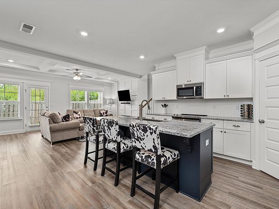 This exquisite 3 bed/2.5 bath end unit townhome boasts luxury vinyl tile flooring in the foyer, extended foyer, laundry, bathrooms, kitchen, dining, and great room. The kitchen features custom cabinetry, tile backsplash, granite countertops, and stainless steel appliances.