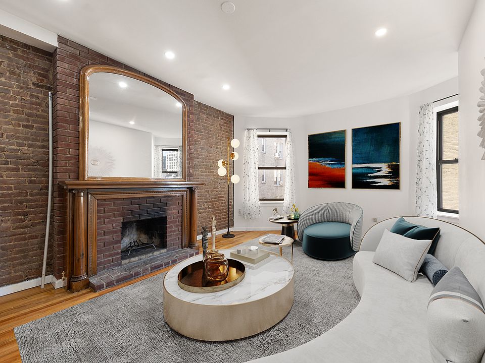 The unit has been recently renovated and comes equipped with new kitchen cabinets, stainless steal appliances, a small island for additional counter space, central air units, large bay windows that receive excellent natural light, and a wood-burning fireplace outfitted with a large antique mirror.