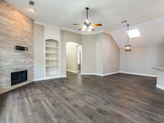 Charming Cape Cod style home in sought after neighborhood of Griffin Parc; Cambridge Homes luxury patio series. Picture yourself sitting on your large covered front porch overlooking the greenbelt park that is located across the street. This move in ready beautiful single-story home has so much charm and attention to detail as well as many custom features; barn house doors, floor to ceiling stone fireplace, crown molding, wide baseboards, built ins, window seat, vaulted ceilings, custom newly painted kitchen cabinets. This spacious, open floor plan offers complete privacy from neighbors, skylights, split bedrooms, lovely outdoor space with a brand-new deck. Home has been recently repainted inside and out, and HOA maintains the yard. Walk to one of the two neighborhood pools, parks, and award-winning Pink elementary and Griffin middle school and zoned Wakeland HS. Located near DNT, PGA, as well as tons of shopping and restaurants!
