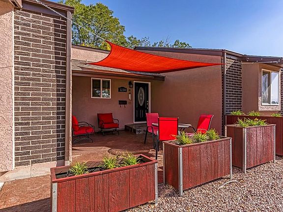 This beautifully remodeled 3 bedroom, 2 bath ranch style home offering a perfect blend of modern luxury and classic charm . This home sits in the desired neighborhood of Country Club Heights, close to the golf course, shopping and nearby restaurants with easy access to I25. The home features a welcoming front patio courtyard that invites you into the spacious living areas, complete with stunning laminate wood flooring. The high-end remodel includes luxurious marble 12 x 12 tile countertops complemented by a sleek backsplash and stainless steel appliances, including a 5 burner gas range top, high end oven and built in dishwasher and tile floors A gorgeous kitchen island with drop lighting is perfect for the home chef. Both bathrooms are elegantly updated, the main bathroom features marble countertops, tile showers and modern elegant double sinks, exuding a spa-like atmosphere. The home also boasts two sliding glass doors, leading to a large back deck, ideal for outdoor entertaining. The expansive, beautifully landscaped backyard provides ample space, while the additional extra large heated one car garage offers extra space for studio, gym or storage for your toys. The extra garage along with the attached finished, 2 car garage are a unique feature for this area and provides ample storage space. The front yard is thoughtfully designed with low-maintenance xeriscaping and planter boxes strategically placed for privacy, creating a clean modern look.