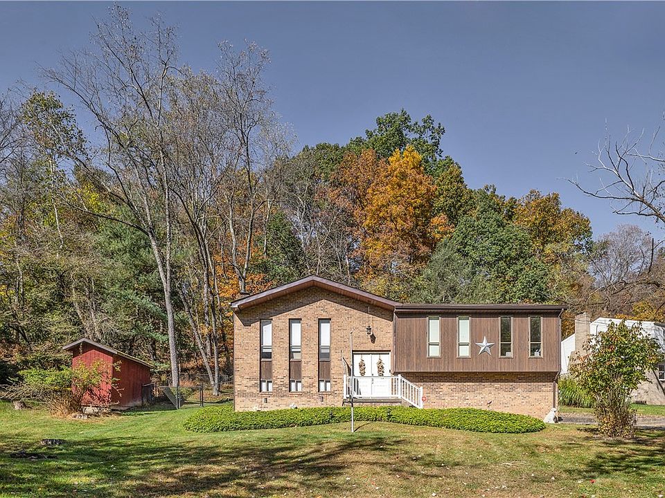 This one-acre (plus) property is a perfect blend of privacy and wooded views, while being so close to miles of commercial businesses. Step into this beautiful oversized contemporary split entry home and be impressed with the open concept that features a cathedral ceiling! Every room offers an abundance of natural light! Updated kitchen with a wood beam ceiling. (Gas stove) Walk out to a peaceful patio and a large back yard that offers a fenced in area, ideal for kids and pets! Three baths and three spacious bedrooms. The main bedroom has a newly updated full bath and two closets. Perfect for one floor living! The finished basement has a log burning fireplace! An inviting space to entertain guests! Large two car garage with tiered shelving. This home offers a long list of newer updates 2018-2025. roof/gutters/electric panel/flooring/updated kitchen with newer appliances/updated baths/fence/shed and more. Great Location! (rt. 22, turn pike, 376) Easy commute to Pittsburgh!