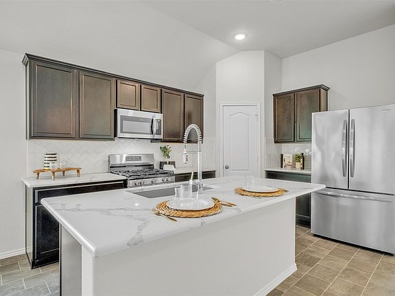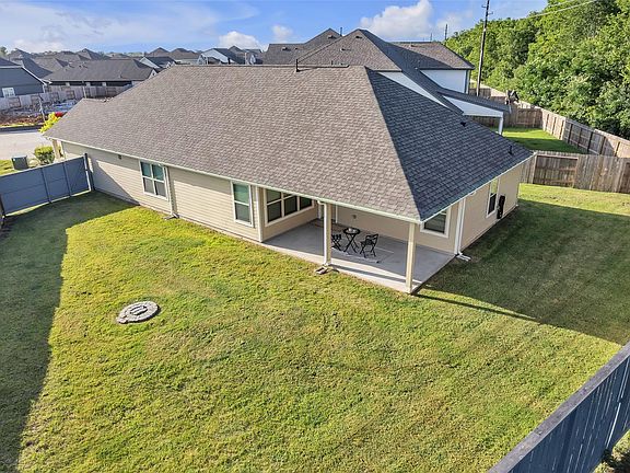 Better than new and move-in ready! This upgraded one-story home on a large premium homesite features 3 bedrooms, 2 baths, formal dining, and a flex space ideal for a 4th bedroom or office. The third bedroom includes a private door to the primary—perfect for a nursery or sitting area. Vinyl flooring extends through the entry, kitchen, breakfast, utility, and all baths. The kitchen offers quartz countertops, island, stainless steel appliances, upgraded backsplash, and refrigerator. Home includes upgraded lighting throughout, full security system with cameras, and in-ceiling speakers in the kitchen, garage, and patio. 2” window blinds, sprinkler system, full gutters, and a large covered patio complete the home. Community provides front lawn maintenance and future amenities are coming in 2025/2026.