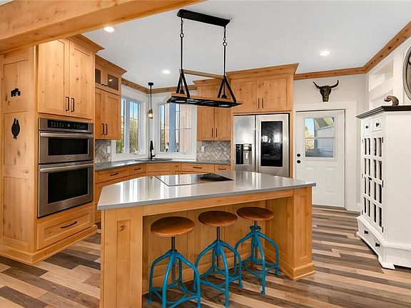 Inside, you’ll find hardwood floors throughout and a thoughtful main-level layout with the primary suite, second bedroom or office, laundry, and garage all on one level. The custom kitchen is a showstopper—featuring floor-to-ceiling cabinetry, an oversized island with seating, farmhouse lighting, and a charming corner window. Both main-level bathrooms are beautifully designed, blending modern luxury with farmhouse charm.