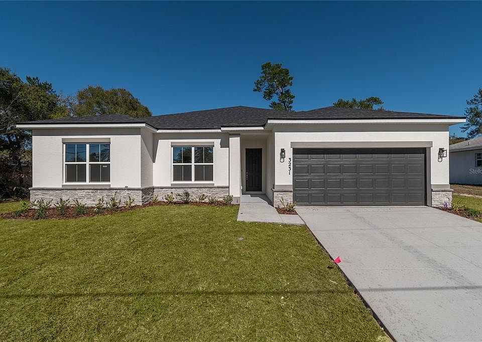 Impeccably designed brand new concrete block construction 4-bed 3-bath home located on a great central lot close to everything Ocala! From the moment you arrive, you will notice the difference with the elegant stacked stone exterior, volume 9'4'' ceilings throughout the entire home and modern open floor plan. The main living space is centered around the massive Great Room with stunning 8 foot triple panel sliding glass door that overlooks the covered lanai which perfectly integrates the indoor/outdoor living space. The kitchen showcases Quartz countertops, Samsung stainless steel appliance, 42'' upper cabinets, and oversized island. Owner's Suite features trey ceiling, oversized dual sink vanity, tastefully designed subway tile shower with glass enclosure, and his & hers closets. All guest bedrooms are well sized with ample closet space. Guest bathrooms both feature tub/shower combo with floor to ceiling tile. Laundry room includes additional linen storage plus washer and dryer are included. You will fall in love with this home, so don't wait schedule your private tour today!