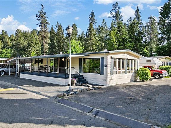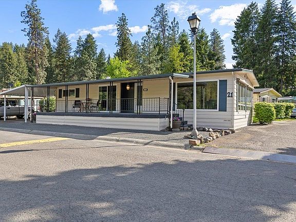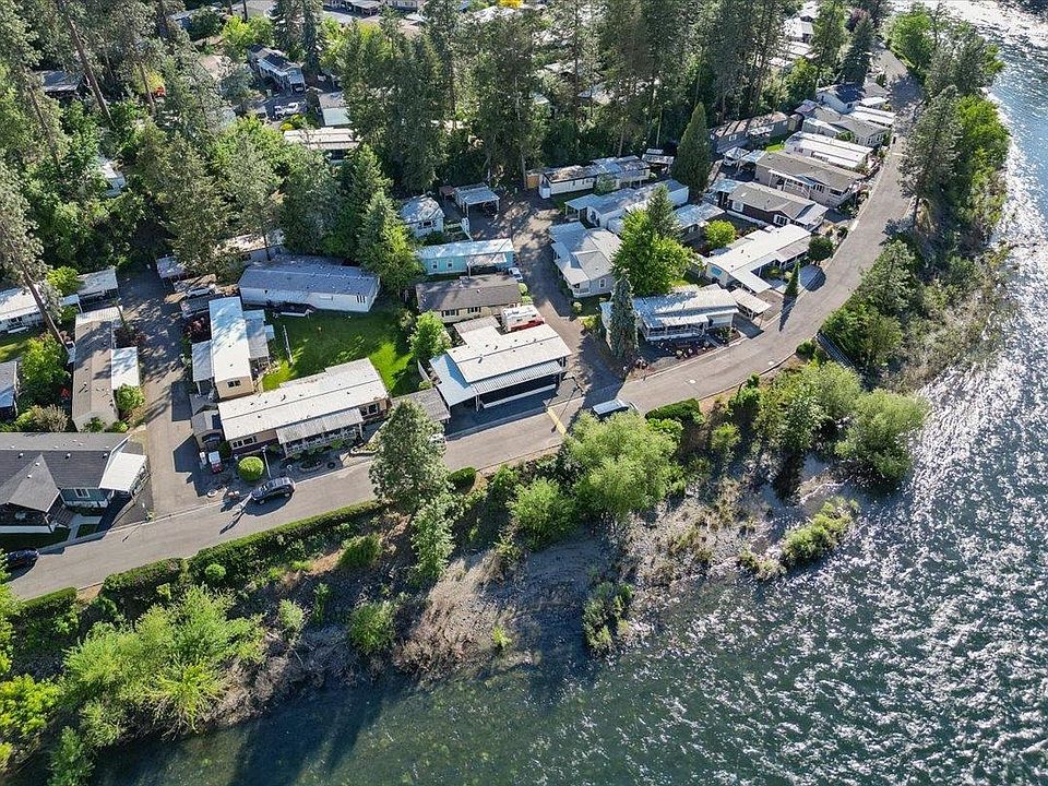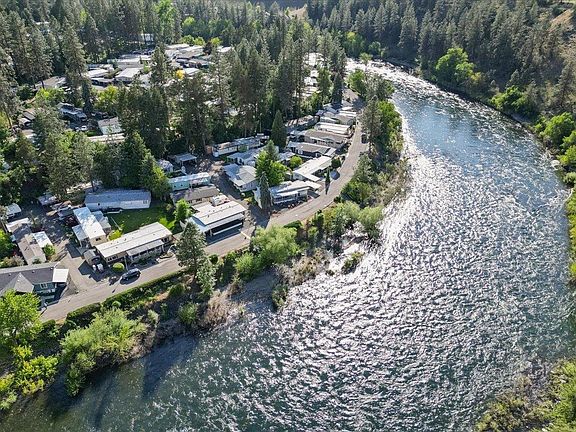 Wake up each morning to breathtaking views of the Spokane River and spend your days relaxing on the spacious front porch - the perfect spot for coffee, wildlife watching, and soaking in the peaceful setting. This beautifully updated 2 bed, 2 bath home sits on one of the BEST lots in Sans Souci West, a 55+ gated, riverfront community just minutes from downtown Spokane. Riverfront lots rarely come available, making this a truly special opportunity. Enjoy quiet surroundings, towering pine trees, and well-kept landscaping. The home features a comfortable layout, covered carport, and recent updates throughout. Low lot rent includes snow removal and summer landscaping. Community amenities include a seasonal pool, clubhouse with full kitchen, fitness room, library, putting green, weekly activities like Tai Chi, painting, game nights, and social gatherings. Learn more at www.sanssouciwest.com/about