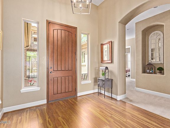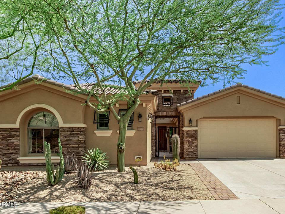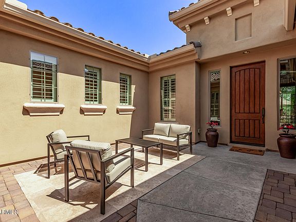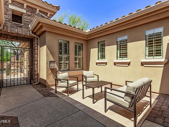 Stunning TW Lewis home in a quiet, gated community in Sonoran Foothills. Stylish and functional floor plan with plenty of space to live, work and entertain. Warm neutral finishes, custom maple cabinetry, granite counters and plantation shutters throughout. Gourmet kitchen abuts den with stacked stone fireplace. Separate area for dining room if desired. Huge primary suite with walk-in closet, 3 additional bedrooms plus a large bonus space. Garage has epoxy floors and cabinets. An intimate courtyard upon entry and a spacious backyard with gorgeous desert views. Property backs to a wash making it very private and serene. Extensive walking, hiking and biking trails from your front door. Community amenities include parks, basketball, volleyball, tennis, pickleball, pool, spa and splashpad. Easy access to I17 and 303.