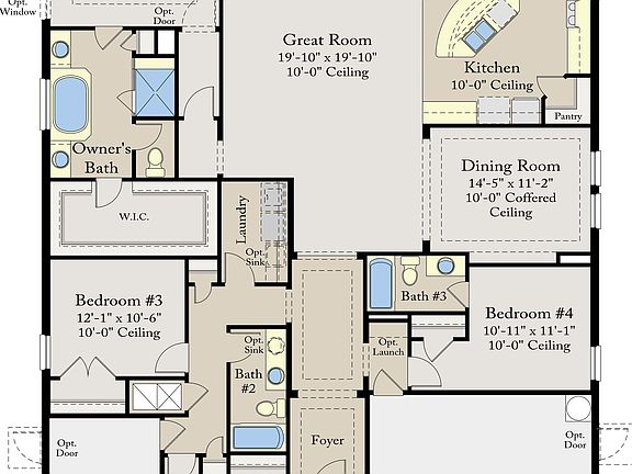 The Hamilton's functional one-story design features incredible connectivity between the living spaces. The gourmet-inspired kitchen overlooks the spacious great room and casual dining, perfect for entertaining guests. The secluded owner's suite is situated along the rear of the home and boasts an incredible bathroom with separate sinks, a garden tub and shower.