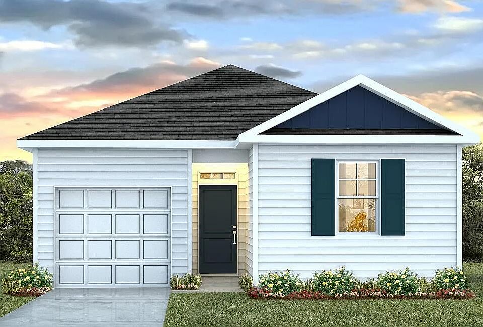$6,000 TOWARDS CLOSING And SELLER PAID INTEREST RATE, AS LOW AS, 5.5% w/Preferred Lender! This floor plan is a 3 bedroom and 2 bath, 1184 sq ft home with one-car garage. O[pen layout optimizes living space with an open concept. As you enter the foyer you are greeted with a spacious living room and spacious kitchen featuring stainless steel appliances with ample counter space. The living room is complete with a view to the covered patio outside. Bedroom 1 is located at the front of the home for privacy, has an ensuite bathroom that features a walk-in closet. Two additional guest bedrooms and one bath are tucked away down the hall from the Dining Room. All the homes in Captain's Corner includes Safe Haven Smart Home Technology is included with every new home. Control the thermostat, front door light and lock, and video doorbell from your smartphone app or with voice commands to Alexa! REQUEST INFO The photos you see here are for illustration purposes only, interior and exterior features, options, colors and selections will differ.