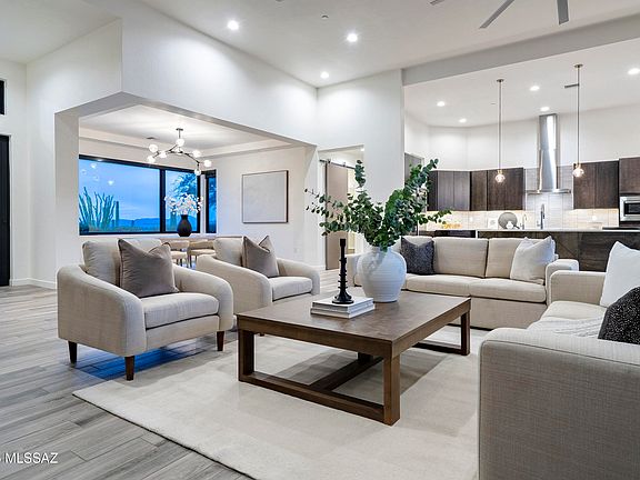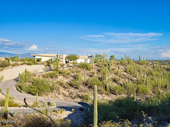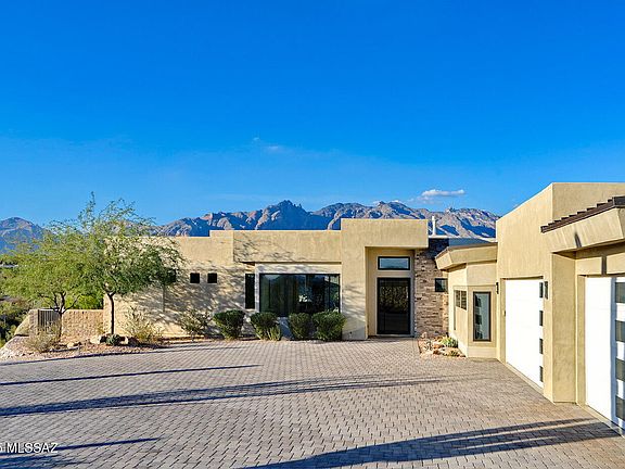 Stretching boldly across one of the largest lots in the prestigious, guard-gated Catalina Foothills 10 community, this commanding contemporary residence is sited on 3.22 acres. A long, meandering cobblestone driveway winds elegantly through the landscape, guiding you to this hilltop residence, where architecture and nature converge in harmony. From this vantage point, sweeping vistas unfold in both directions, with Catalina Mountain views to the north and panoramic city views to the south, creating a living environment that celebrates the beauty of both desert and skyline. The arrival sequence of this striking home establishes a powerful visual dialogue, juxtaposing the clean, sculptural lines of the architecture against the natural contours of the land. The stucco clad exterior asserts a contemporary statement across two central view corridors. Just off the motor court, a large oversized three-car garage offers both convenience and seamless integration into the property's design.