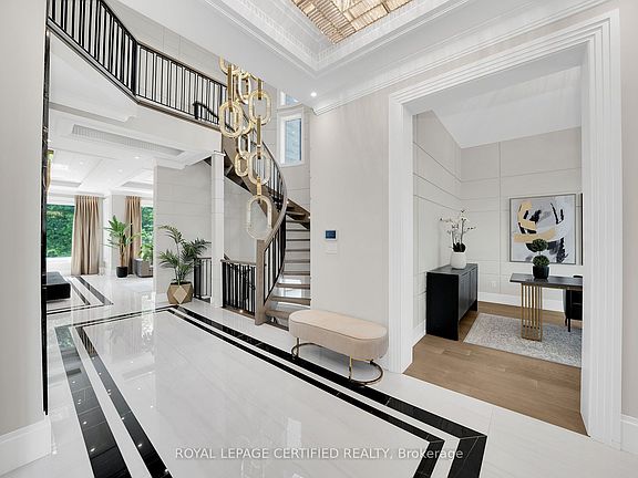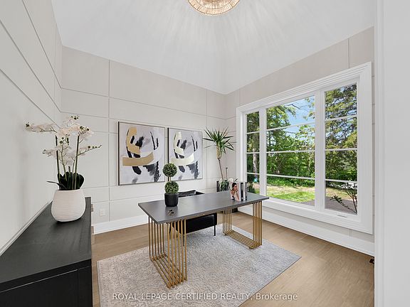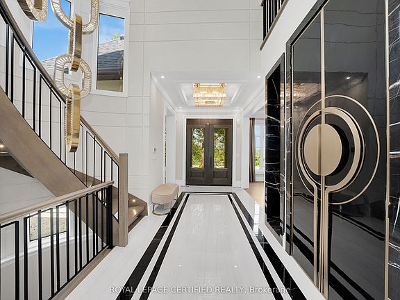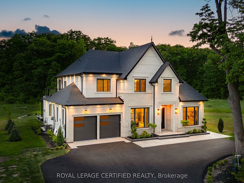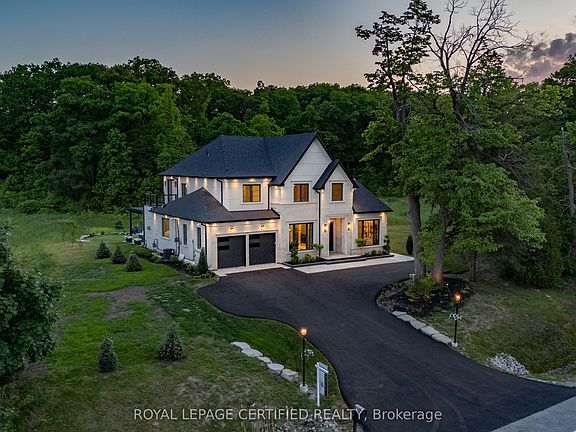 Discover refined luxury in this custom-built 4-bedroom residence, ideally located near Burlingtons prestigious Bluffs neighbourhood. Surrounded by Greenbelt and offering unobstructed views, this home is a rare blend of privacy and elegance.The exterior showcases timeless natural stone and stucco accented with elegant lighting. Inside, the double doors open to a grand foyer with soaring ceilings, wrought iron staircase, and statement chandelier.The formal dining room features designer finishes, while the spacious great room highlights an onyx stone gas fireplace and oversized windows framing breathtaking views. The chefs kitchen is equipped with high-gloss cabinetry, porcelain countertops, and premium Thermador appliances, complemented by a lounge area and sunroom with panoramic vistas.Walk-out access leads to a serene backyard retreat backing directly onto protected Greenbelt land with mature trees, covered patio, and ample space for entertaining or quiet relaxation.The finished walk-out basement adds versatility with a suite, ensuite bath, and kitchenetteperfect for extended family or guests.