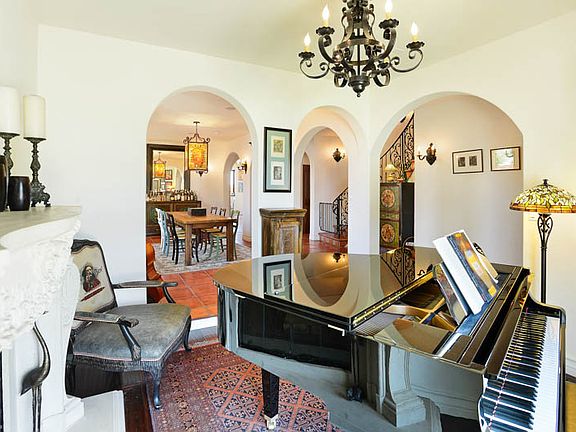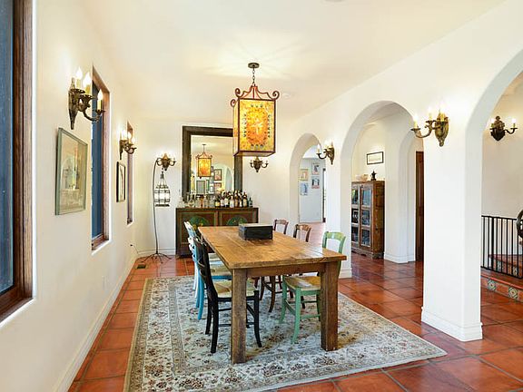 Spanish Revival Pool Home with Amazing Views. This custom and impressively built home has breathtaking views from downtown LA to Century City. You’re welcomed by earth red terracotta tiles, hand painted stair risers, arches and dark hardwoods which carry out the Spanish baroque influence. Each room has been appointed with rich surfaces, hand wrought sconces and traditional Spanish details. The formal living room with fireplace is a warm welcome to the home and an impressive formal dining room will be enjoyed by family and friends for years to come. The over sized kitchen has custom cabinetry, granite counters and wine cooler in the center island. There is a professional grade refrigerator with cabinet fronts and Viking appliances which include three ovens, a microwave and eight burner range. Views of downtown LA can be had from the breakfast table. The adjoining family room, also with fireplace overlooks the saltwater pool/spa with hardscape and built in BBQ. Upstairs is a master suite to be envied. There’s a fireplace, terrace with full city and mountain views, an over sized walk in closet with built ins and a very special master bath. The bathroom has marble counters, stone floors, separate shower and claw foot tub overlooking the city. The other bedrooms are all en suite and there’s also an office upstairs.