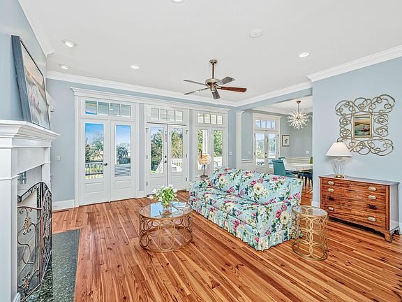 Welcome to 3232 Pignatelli Crescent, a stately antebellum style home located on the 18th hole of the Dunes West golf course and Wagner Creek. This unique property sits back on a 1.6 acres lot and is one of only two properties in the Dunes West community with golf and water access. The lot is very private, set back from the street with a long drive covered in mature landscaping. The exterior of the home features a circular driveway, beautifully landscaped grounds, a dock with seating and small floating platform, a fenced and level back yard, a double brick front staircase and 1,000 square feet of deep double porches in back. The interior of the home showcases a five bedroom layout with four full baths and one half on the main entertaining level. The owner's suite,located off the living room on the first floor, includes two large walk in closets with shelving, a spacious and sunny bathroom and double doors that provide access to the back porch. The porch swing is a relaxing spot to enjoy morning coffee while taking in the views of the marsh wildlife and golfers finishing their last putt on the 18th green. The first floor also includes a dedicated office with built-in mahogany bookshelves, a formal dining room with paneling, a sunny living room with a gas fireplace and bookcases and storage, all leading to the back porch and rear staircase. An eat-in kitchen with access to an all weather screened porch, a family room beside the kitchen for relaxing and watching television, and a walk in pantry, overflow pantry area and laundry room complete the layout. The kitchen was updated in 2020 with quartz countertops and new appliances. The wet bar area across from the blue marble island is a great option for serving guests. On the second floor is a large media room/playroom with access to the 2nd exterior porch and more stunning views of the marsh and golf course. There are four generously sized bedrooms upstairs, two with ensuite baths and two that share a bath that offers dual vanities. The enormous three car garage follows the footprint of the first floor, and provides parking for three cars, golf carts, etc. The bays are long enough to accommodate a day boat and trailer as well. A new metal roof was installed in fall 2024, and the irrigation system is accessed by a private well on the property. HVAC units date from 2020 and 2021. There is new soft duct work in the garage ceiling. The home is a short walking distance from Dunes West country club amenities which include the clubhouse, driving range, the adults only swimming pool and pickleball court. Tennis courts, the exercise studios and two additional swimming pools are a quick bike ride away. Membership to the club is available to all and easy to join.