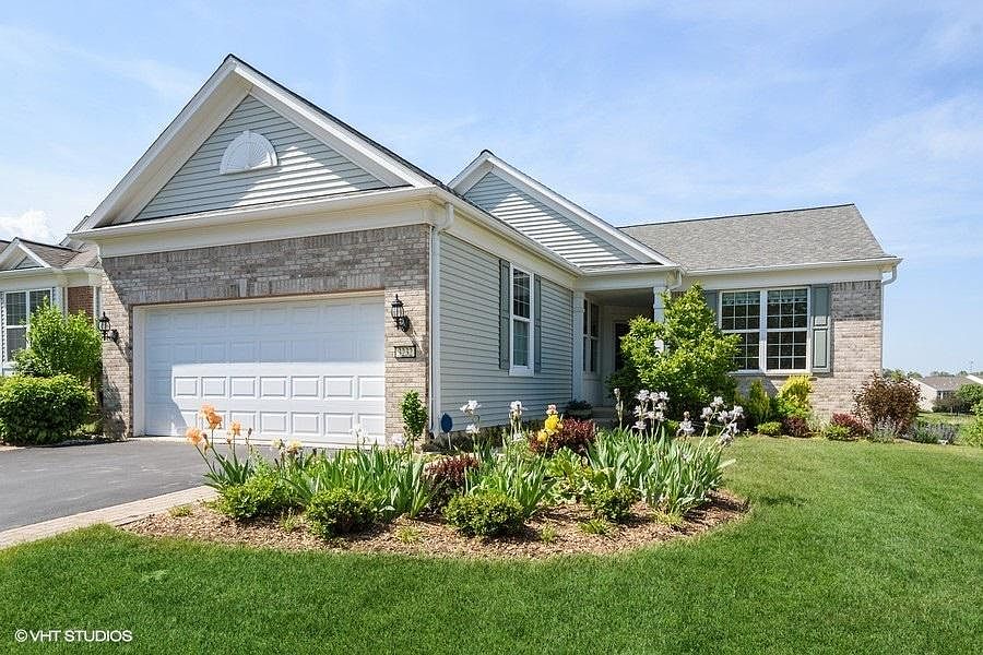 SERENE & PEACEFUL VIEWS ON THIS PREMIUM LOT ... and SO MANY "AFTER MARKET UPGRADES & IMPROVEMENTS" in this BEAUTIFUL Clark model with finished, walk out basement. Features include: open layout, hardwood floors, crown molding throughout, oil rubbed bronze door handles & hinges throughout, 2 bedrooms, 2 1/2 baths + living room, office and elevated deck overlooking conservancy area. UPDATED kitchen with white cabinets/quartz counters, glass tile backsplash, GE/KitchenAid/LG stainless steel appliances & custom cabinet lighting. Remodeled primary bath with Bain Ultra AirJet tub and tiled shelving + custom closet. Basement staircase with iron rod spindles lead to finished walkout basement with recreation area, half bath & 2 HUGE storage rooms. Laundry room w/cabinets and Duet washer and dryer. NEW carpet in office and bedrooms. Insulated garage with epoxy floor, storage cabinets and new garage door opener in 2021. Perennials a plenty...daffodils, irises, Rose of Sharon, crocus, hydrangea bushes, geranium + many more. NEW high efficiency furnace, A/C and garbage disposal in 2020. Extras = windows have casings and sills, built-in surround sound in the home, brick elevation, shutters. Grand Dominion 55 and older offers: OUTDOOR & INDOOR POOLS, TENNIS, BOCCE BALL, MILES of WALKING PATHS, CLUBHOUSE w/FITNESS CENTER, MEETING ROOMS & ORGANIZED ACTIVITIES = SO MUCH TO DO! Ask agent for list of improvements.