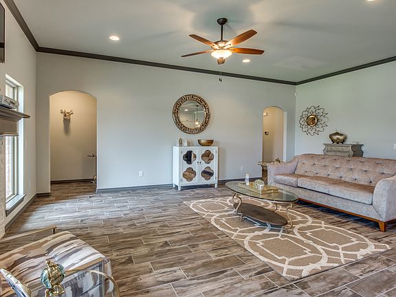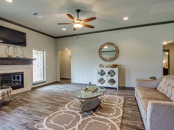 The Shiloh 2200 floor plan has 4 bedrooms with optional study, 2 full bathrooms with a 3 car garage. Storm shelter built into the garage floor! Fully sodded front and back yard with underground sprinkler system and landscaped beds in the front. House is wired with a security system. Whole house has custom cabinetry and granite counter tops throughout! Living room has a gas fireplace with stack stone surround and large windows on either side. Kitchen has an island with a 60/40 sink, stainless steel appliances decorative tile backsplash, and a spacious pantry. Master bedroom has a boxed ceiling with crown molding detail and a en suite bathroom that features a walk in closet, dual sink vanity, whirlpool tub and spacious walk in shower! Front bedroom would make a great study with a ceiling fan. Extended patio space for those spring and summer nights with your friends and family. This home comes with blinds, 2 garage door openers, fence with one gate included!