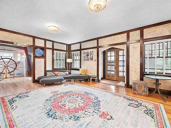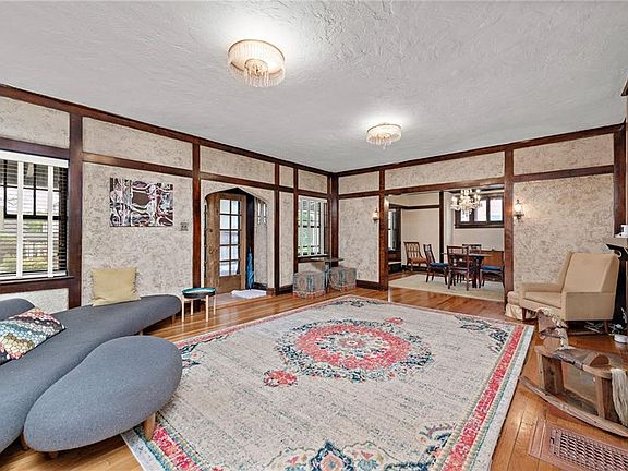 Designed by the famous architecture firm Roots & Siemens, this Spanish Eclectic home was deemed "a house that is different" at the time it was built. The uniqueness carried on throughout the next rounds of renovations creating a ship in what was the first floor library and the addition of art deco elements. Featuring many original features such as the oak hardwood floors throughout, wood trim details on the walls of the front living room, the craftsman coffered ceilings in the formal dining room, and doors. The full bathroom in the center of the house also has an original and unique turret allowing tons of natural light. It is said the original owner has this put in so he could watch the planes fly over. The main floor also features three bedrooms with one of them having a half bath attached and an expansive sunroom off of the rear allowing you tons of opportunities for use! Either taking the spiral "ship" staircase down or the main staircase off of the kitchen, you will end up in the finished lower level where things get even more unique. Room one is the billiards room off of the attached garage. This large room offers tons of windows for natural light. There is also a second half bathroom and laundry room/kitchenette nearby. Then you enter the grand hall with soaring ceilings, wood paneling all the way around, a wet bar, and a central fireplace. Up a few short stairs lead you to the side yard walkout and to another unique original feature of the home, the indoor pool located under the front porch. So much outdoor entertaining potential from the backyard with views of the Kansas City Museum or the expansive covered front porch overlooking Windsor Avenue. You can also find a detached 2-car garage in the rear giving you tons of parking or storage space. There is no shortage of charm or uniqueness in this one-of-a-kind home and still has plenty of room to add your own touches! Located in the Scarritt Point historic district and minutes from downtown Kansas City!
