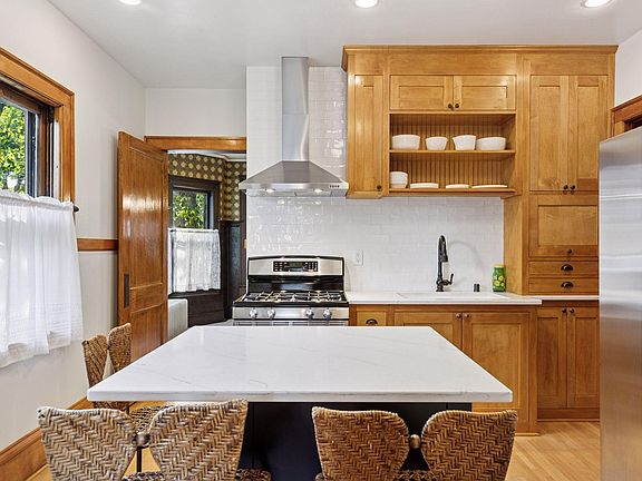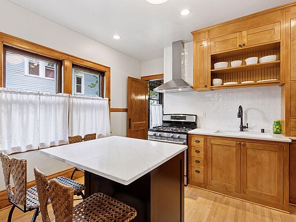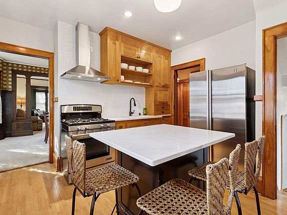 beautifully renovated second-floor suite, currently used as a family room. The kitchen is a true centerpiece with custom cabinets made to match the original cabinets found in the walk-in pantry. A center island was added for additional seating and a dishwasher. The seller has carefully preserved the original charm, including original pillars and built-ins, while adding modern conveniences. Outside, the double lot surrounded by a beautiful wood privacy fence boasts a paver patio, gazebo & in-ground pool.