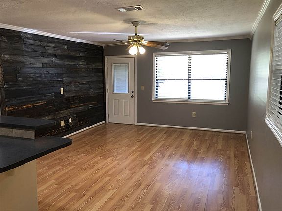 Adorable beginner! Freshly painted inside and some new floors. Awesome kitchen remodeled completely in 2009 with big breakfast bar,nice stainless appliances that includes a Gas Stove,built in microwave & SS side-by-side Fridge. All windows replaced with energy efficient ones about 7 years ago. Split BR plan with Master off kitchen with laminate flooring,double closets & nice Bathroom that includes the Laundry area. Exterior door to rear yard from MBR. Family Room on front with lots of natural light,laminate floors, decorative pallet wall & is open to kitchen/dining area. Built-in desk with storage off kitchen as well. The other 2 bedrooms have fresh paint & fans-plus another cool pallet wall in one. There's a 4th bedroom but without a closet(so didn't count it in BR count) at end of hall with new laminate & big window...perfect for office,nursery or child's playroom. Guest Bath was completely redone about 2 years ago with new toilet,vanity/sink,light,mirror,flooring/decking & standup shower. Central H/A is only 8 yrs old & water heater is only 1 yr old. New Electrical panel installed in 2009. All of this plus it's situated on beautiful large corner lot. Single carport but also an uncovered parking pad or patio adjoins the carport. Spacious rear patio off Master BR too. Don't wait on this one....it should go fast!