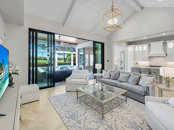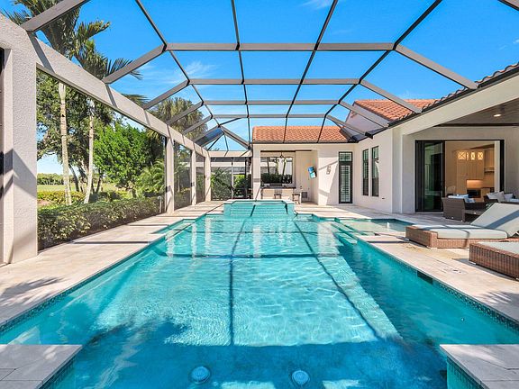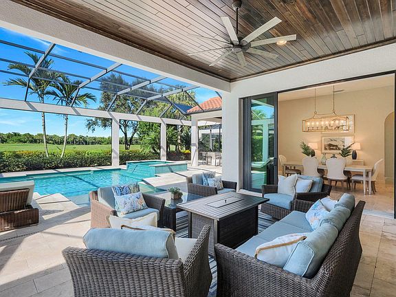 Refined Luxury Living in Fiddler's Creek. Experience sophisticated resort-style living in this beautifully curated residence located in the prestigious community of Fiddler's Creek. Perfectly positioned to capture wide golf course vistas, this home blends modern design with timeless elegance, surrounded by professional landscaping and enhanced by ambient evening lighting. Step through elegant French doors into a light-filled interior highlighted by 14-foot ceilings, a graceful foyer, and striking designer flooring. The spacious great room seamlessly extends outdoors through 10-foot impact glass sliders, revealing a spectacular lanai complete with a resort-style pool and spa, sun shelf, bubblers, and an impressive summer kitchen—perfect for entertaining or quiet relaxation. A wood-accented ceiling adds warmth and architectural character to this inviting outdoor retreat. The gourmet kitchen is both stunning and functional, showcasing an expansive white quartz island, KitchenAid appliances, and custom cabinetry with glass-front uppers and pullout shelving. A bespoke range hood, refined lighting, and plantation shutters throughout the home contribute to a sense of understated luxury. The primary suite is a serene sanctuary featuring a comfortable sitting area, an exceptionally large walk-in closet, and a spa-inspired bath with exquisite finishes. Three additional en suite bedrooms, each with generous closets, offer comfort and continuity of style. A chic powder room off the entry hallway and a spacious laundry room complete the interior. A three-car side-load garage, extended driveway, and enhanced architectural elevation lend curb appeal and convenience. Residents of Fiddler's Creek enjoy award-winning amenities, including a newly renovated lagoon-style pool, spa, fitness center, and an active social lifestyle with pickleball, tennis, and casual or fine dining options. Memberships are available for golf, beach, and boating, while the location offers easy access to Old Naples and Marco Island for world-class shopping, dining, and recreation. This exceptional home captures the essence of refined coastal living—luxurious, inviting, and perfectly designed for today's lifestyle.